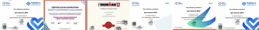 2023. godine sam upisao i uspješno završio Triatlon akademiju pod pokroviteljstvom Svjetske triatlon organizacije (World Triathlon Organization) te nakon urađenih testova dobio Certifikat za trenera triatlona nivo 1 kao potvrdu moje stručnosti i znanja o ovom sportu. Sa nekoliko mjeseci razmaka završio sam i program obuke licenciranog Ironman programa te završio edukaciju u triatlon kampu kod profesionalnog sportaša i trenera Andreja Vištice, sa kojim sam nastavio saradnju i dalje te svi moji treninzi se odvijaju po njegovom programu. Time sam dodatno potvrdio svoju opredijeljenost da dalje napredujem u ovom sportu ne samo kao takmičar već i kao triatlon trener.
